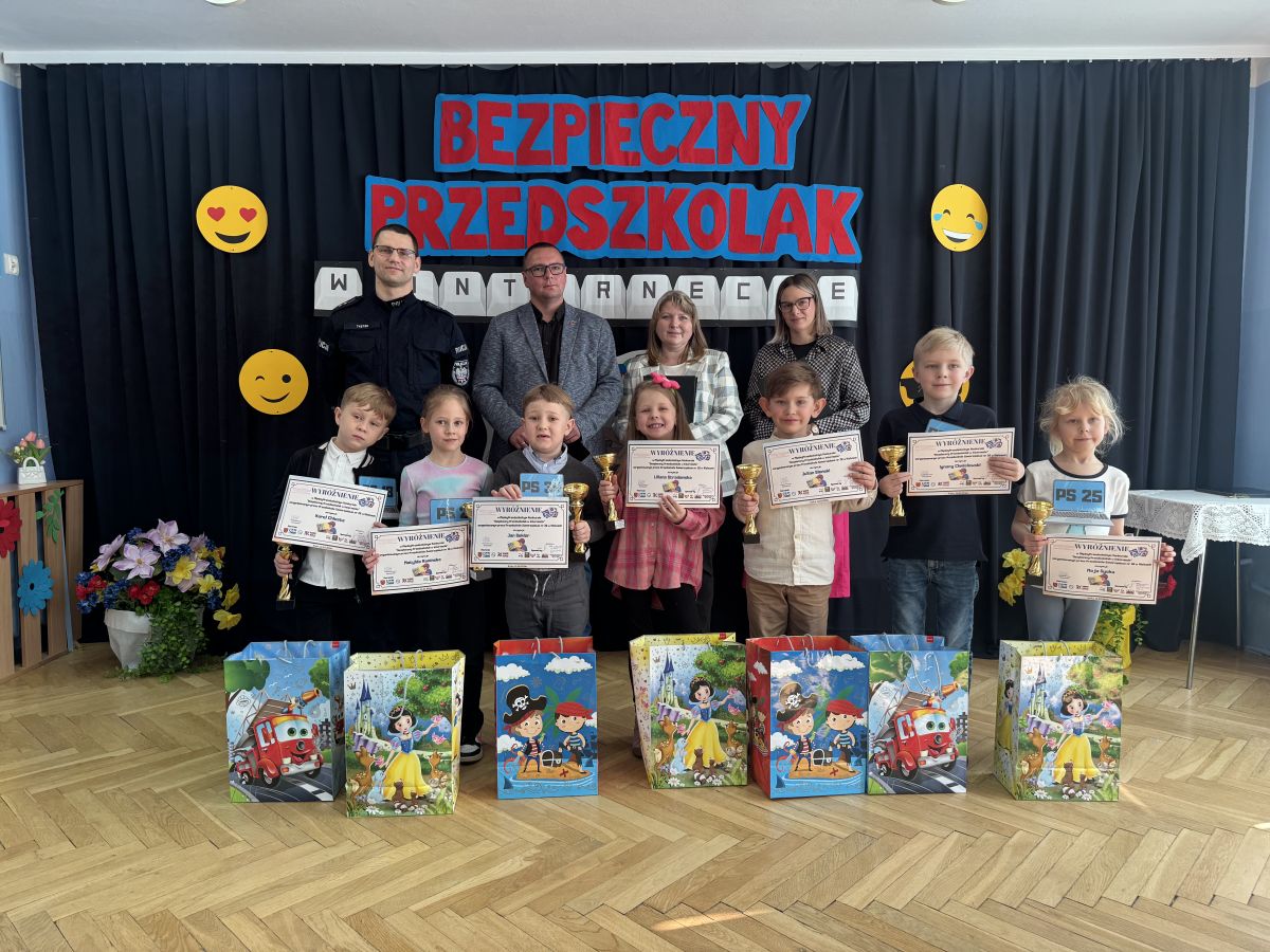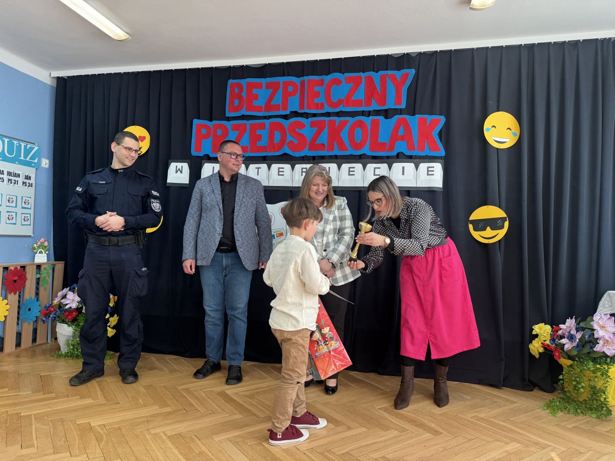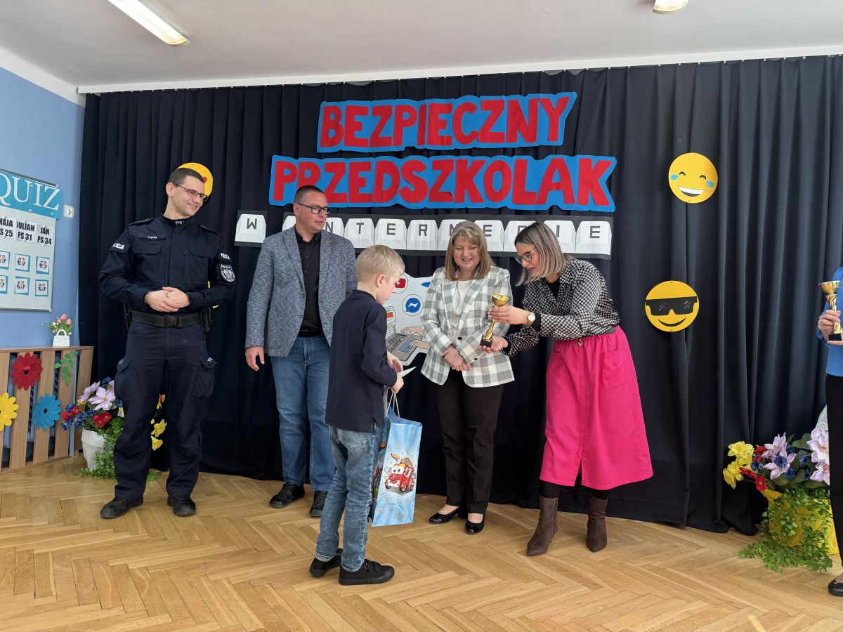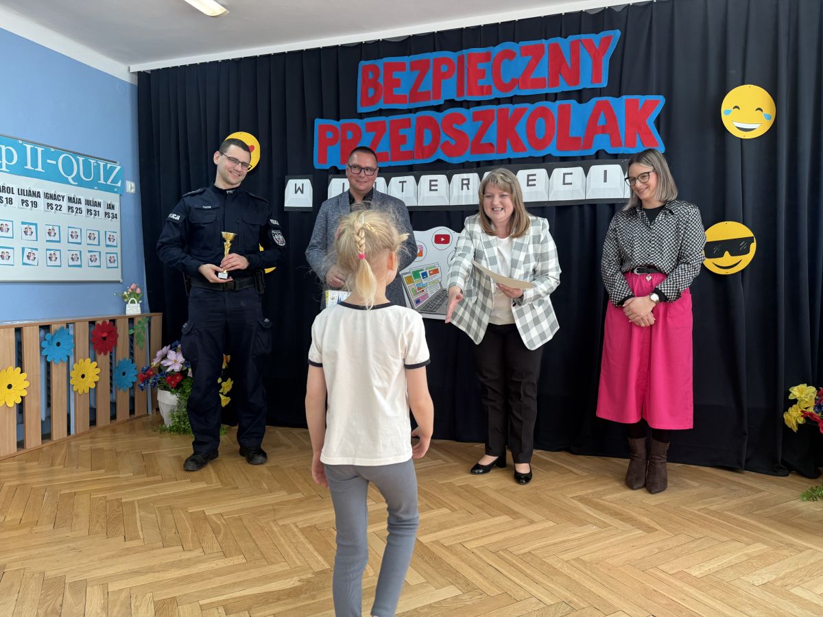 Podczas spotkania uczestnicy wzięli udział w quizie dotyczącym bezpieczeństwa w internecie, odpowiadając na pytania związane z właściwym i bezpiecznym korzystaniem z sieci. O bezpieczeństwie w internecie opowiedział również pan aspirant Łukasz Kubicki, który w przystępny sposób przybliżył dzieciom najważniejsze zasady poruszania się w świecie cyfrowym.